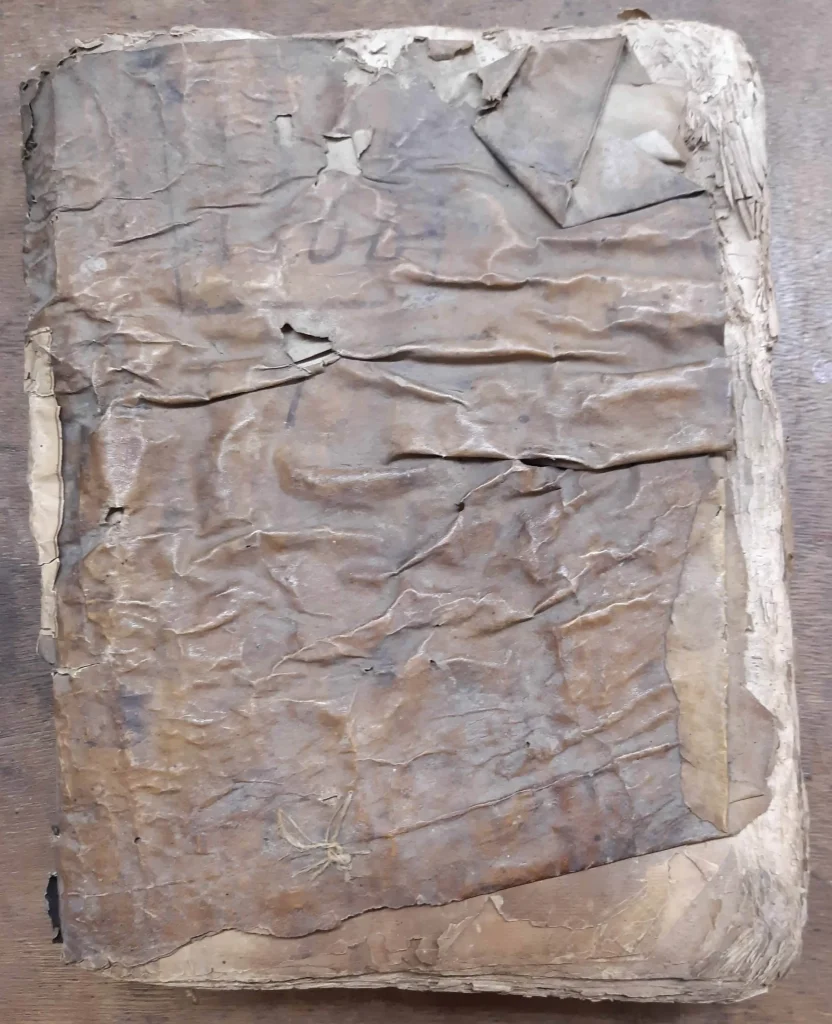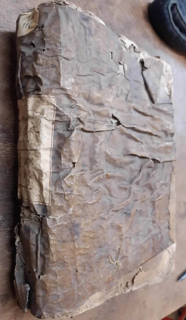 - Couverture en parchemin fortement déchirée, avec des lacunes et des mouillures anciennes (moisissures inactives, le document à déjà été désinfecté).