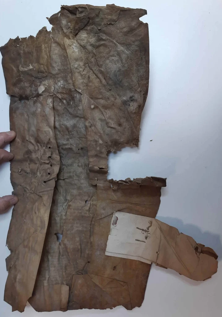 - Une reliure « à la Lyonnaise » en parchemin de réemploi, détachée du corps d’ouvrage.