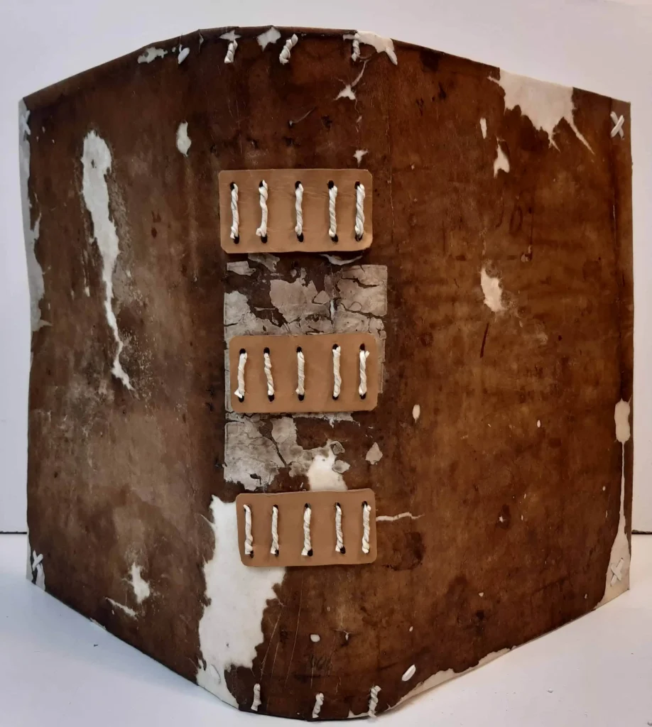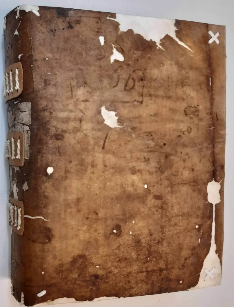 - Reliure souple en parchemin (technique « à la Lyonnaise »), avec des liens torsadés cousus directement à travers la couverture