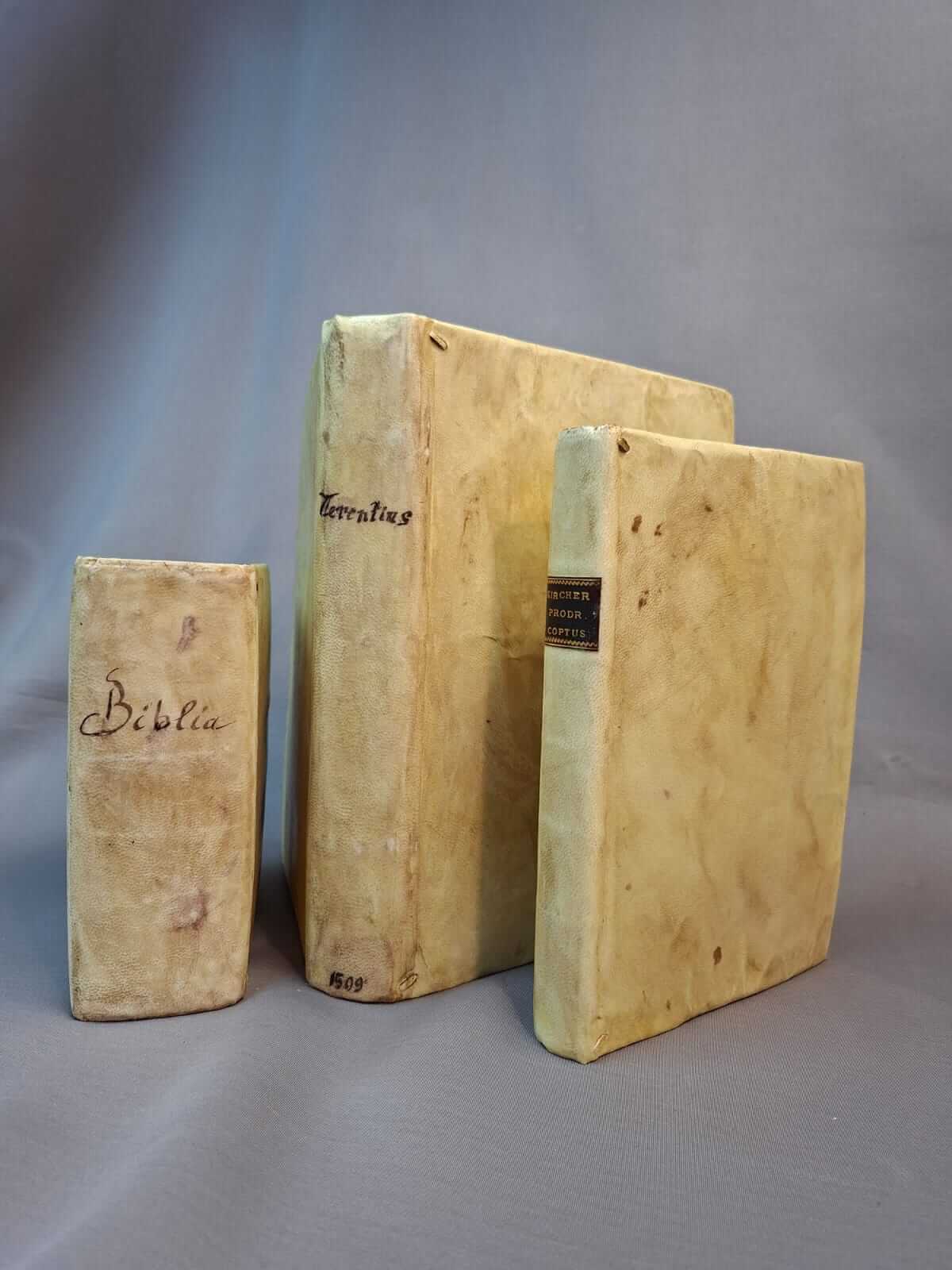 Reliures en parchemin patiné, avec titre calligraphié ou pièce de cuir.