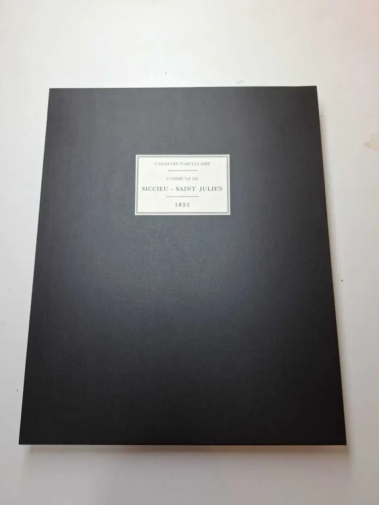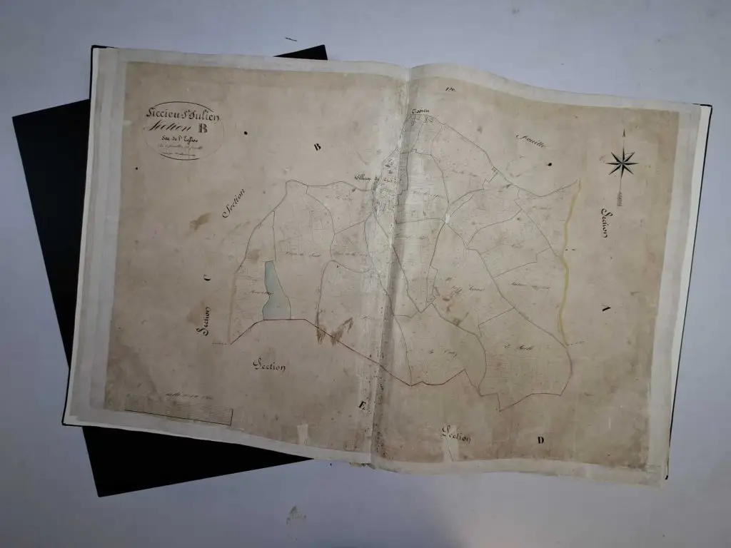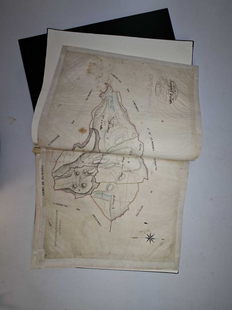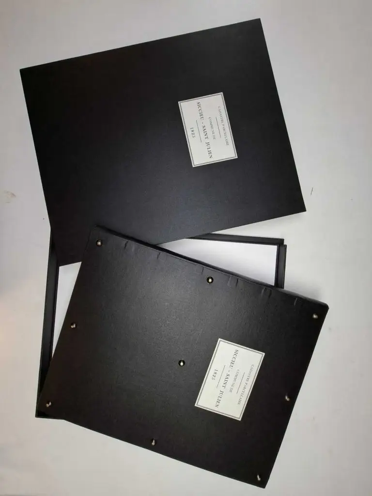 Une boîte de conservation sur mesure a été confectionnée pour protéger une reliure neuve en pleine toile abritant des plans cadastraux restaurés.